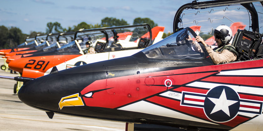 Training pilots make preparations inside T-45 Goshawks as part of the advanced course of the Student Naval Aviator strike pilot training program aboard Marine Corps Air Station Beaufort. (Photo by DOD/Sgt. Dengrier Baez)