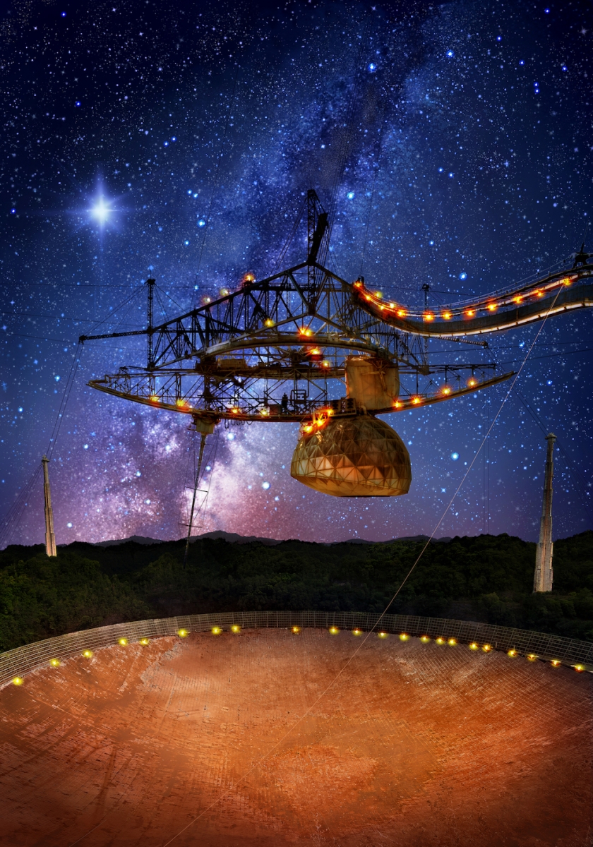 Image: The 305-metre Arecibo telescope, in Puerto Rico, and its suspended support platform of radio receivers is shown amid a starry night. A flash from the Fast Radio Burst source FRB 121102 is seen: originating beyond the Milky Way, from deep in extragalactic space. CREDITS: Image design: Danielle Futselaar – Photo usage: Brian P. Irwin / Dennis van de Water / Shutterstock.com