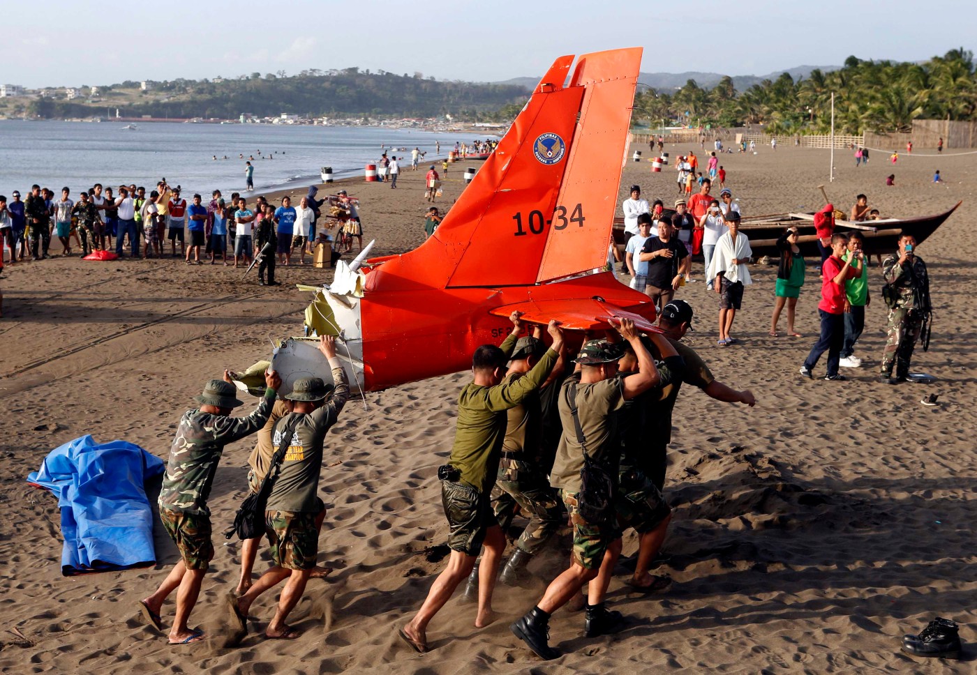 Soldiers carry the tail of an ill-fated Philippine Air Force Italian made light aircraft SIAI-Marchetti SF260 that crashed in the sea off the coast of Nasugbo, Batangas south of Manila (Photo by Reuters)